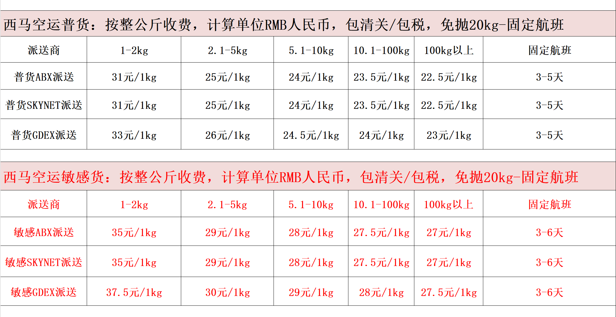 2、空运部分渠道按全抛计费:计算方式按实际重量与体积重量取大收费。